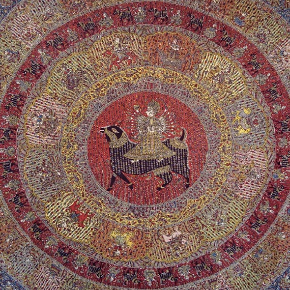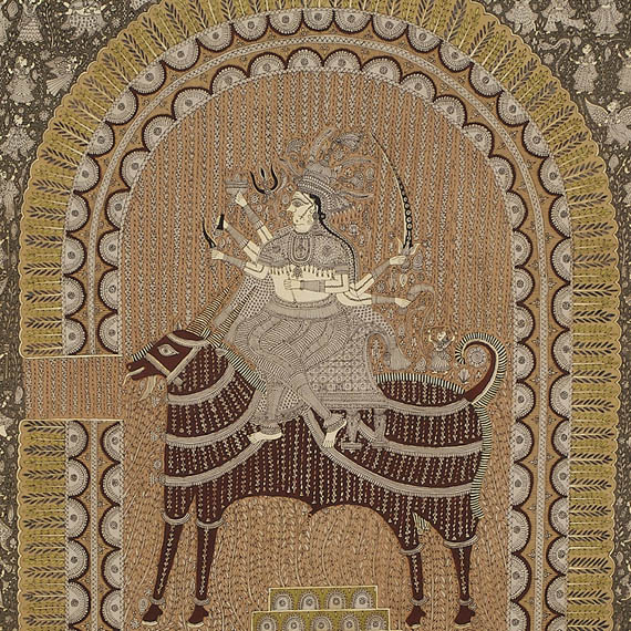 While firmly based in tradition, Sanjay Chitara reimagines and reconfigures the established vocabulary of mata ni pachedis. While retaining key ritual elements, he often reorganises traditional iconographic motifs into new compositional structures, with enlarged standalone images set against stark monochrome backgrounds. On the other hand, the introduction of a new, expanded colour scheme, derived from natural, organic materials combined with an intricacy and attention to detail make his pachedis an exceptional demonstration of craftsmanship.