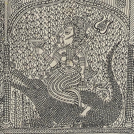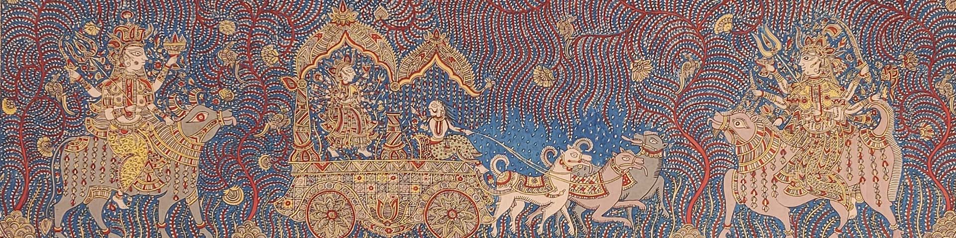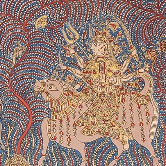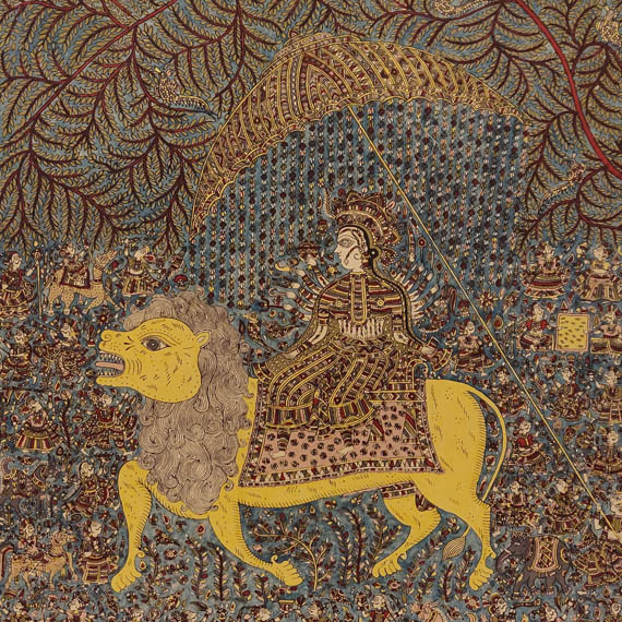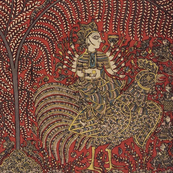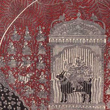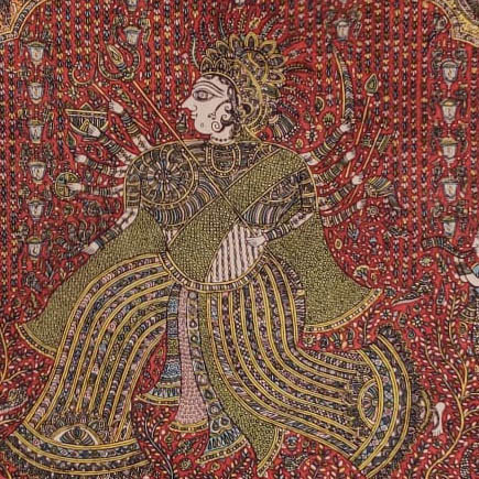 Sanjay Manubhai Chitara (b. 1978) is a leading contemporary practitioner of Mata ni Pachedi, a ritual textile tradition from Ahmedabad. Established in devotional practices, these hand-painted and block-printed cloths serve as sacred backdrops and canopies in the worship of the matas, or mother goddesses. Mata ni Pachedi, literally ‘the cloth of the goddess’, traditionally forms the walls of a temporary shrine, while the square chandarvo functions as the canopy above. Painted traditionally in a distinctive palette of red, black, and white, these textiles centre on an imposing image of the goddess surrounded by narrative mythological scenes, sacrificial animals, devotees, and symbolic motifs. The cloths are commissioned as votive offerings, often in fulfilment of a vow or in gratitude for divine intervention in times of illness or hardship. Once completed, they help create a temporary sacred enclosure where rituals, sacrifices, and communal celebrations, dedicated to the goddess take place. Pachedis are usually displayed during Chaitra (mid-March to mid-April), the first month of Hindu calendar and during Navratri (lit. nine nights), the annual festival dedicated to the goddess Durga.
