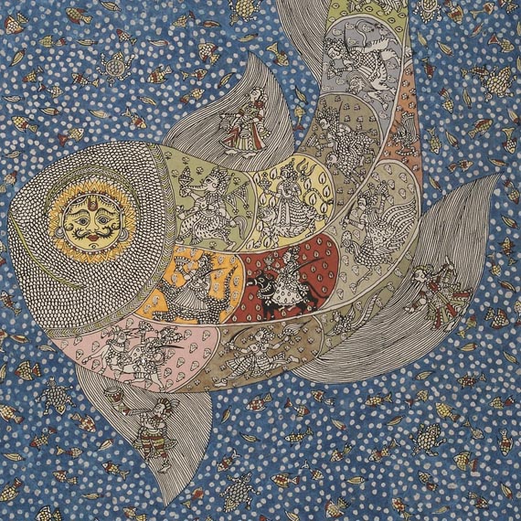 Sanjay Chitara’s works are produced through a meticulous process combining block printing and hand painting on treated cotton cloth using natural dyes. Black pigment is traditionally derived from fermented iron, while red emerges through an alizarin-based dye process; areas left unpainted remain white. Each colour carries symbolic meaning, red signifying energy, sacrifice, and divine authority; black representing protection from evil; and white expressing purity and sacred presence.