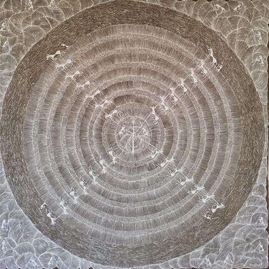 Ramesh Laxman Hengadi (b. 1976) is a Warli artist whose practice is deeply grounded in this inherited cultural vocabulary. Hengadi grew up observing the ritual paintings created during village ceremonies and festivals with these early experiences shaping his understanding of Warli visual traditions. Traditionally executed on mud walls prepared with red ochre or cow dung, Warli paintings are created in white pigment made from ground rice paste mixed with water and natural gum. Using a bamboo stick as a brush, artists construct figures through rhythmic sequences of dots and dashes rather than continuous lines. Human forms appear as stylised figures composed of two inverted triangles joined at their apex, symbolising the fragile balance between the human body and the forces of nature. These compositions frequently depict scenes of agricultural labour, hunting, communal gatherings, and ritual celebrations, reflecting the rhythms of everyday life in Warli society.